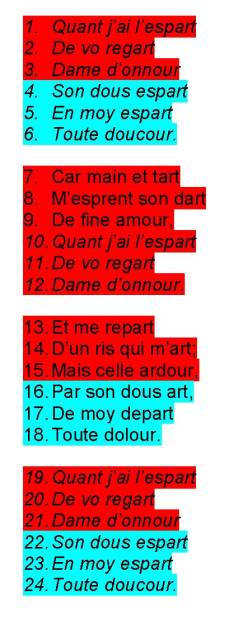 Thus the music of the B section only comes three times, while that of the A section comes five times, including three times in succession starting with its first repetition. Because the letters a and b are being used both for the rhyme structure and for the musical structure — two structures that are related but not commensurate — this can cause confusion. The diagram here seeks to clarify this by representing the A section of the music in red, the B section in blue. Italic script denotes (as before) the refrain text, and the rhyme scheme should be clear. All in all it’s a fascinating poem, with the lover’s burning from love aptly pictured in the two rhymes, ‘art’ (he burns) and ‘our’ from ‘amour’ (love).