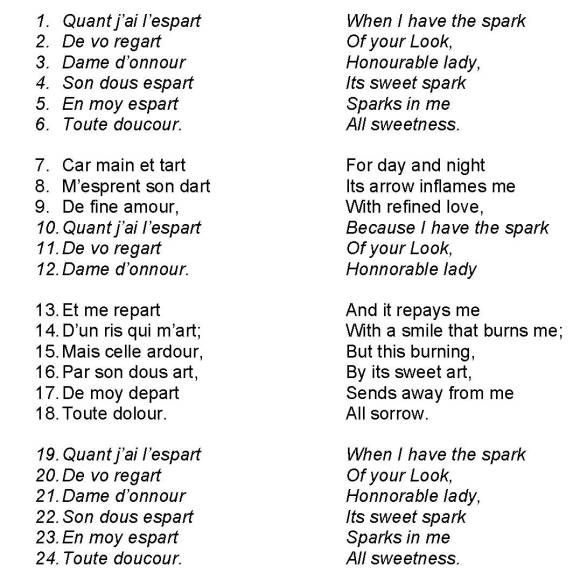 Often, a rondeau will have different rhymes in its two sections, but here the rhyme scheme of each is identical aab aab, with the a-rhyme or ‘-art’ and the b-rhyme of ‘-our’. This means that despite the musical repeating structure of the rondeau being lopsided (the music repeats ABaAabAB, with capital letters denoting the use of the refrain text, shown in italics above), the rhyme scheme makes the poem poetically into four six-line ‘stanzas’ of an identical verse structure, it’s just that the second ‘stanza’ repeats the music’s A section for its second half rather than using the B section.