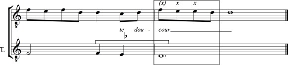 The idea of collapse is emphasized by the cantus rest, during which the tenor sings G and the cantus gratefully joins it with an e, to permit a resolution once more to the familiar tonal goal of F/f at the start of m.6. It is as if the initial weak and failed attempt at the new E/e goal has been abandoned for now and the singers have re-grouped on solid and familiar ground to decide their next move. The cantus proposes a second attempt, repeating the descent that it had tried at the end of m.4 from the f down to a d over the tenor’s F, giving the right sonority for another E/e resolution. But the tenor is having none of it and almost immediately branches out to an entirely new pitch—b-fa. This enables first a directed progression to a/aa and then, using a short cantus linear intervallic pattern, a concatenation of progressions from a/aa to G/g back to F/f and finally, from that secure familiarity, in the last measure to the very same E/e resolution, tried with limited success in mm.4-5. The whole of the text of line 3, ‘Dame d’onnour’ (honoured lady), aids the cantus singer in performing the successful progression from F/d to E/e for the end of the A section.