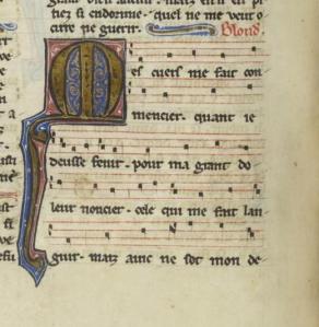 When I wrote the article that appeared in the special medieval issue of Music Analysis last year, one of the original case studies was cut from the final version. This was partly because the article was too long, partly because the song I cut didn’t really fit with the things I was arguing there about Blondel’s careful crafting of intersecting, overlapping, and interacting musical and verbal structures. The cut song, Mes cuers me fait conmencier, was basically rather straightforward, almost boring: in a standard kind of verse form, with a melody that seemed compiled of the commonest defaults of the genre. Although included in the standard modern editions, no one seemed to have specifically discussed or recorded the song since the Middle Ages.